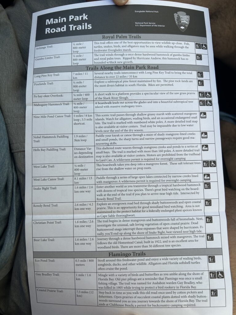 One major area we didn’t visit was the Gulf Coast / Everglades City side of the park. This section is best known for boat tours through mangroves and the Ten Thousand Islands and is a great option if you have extra time or want a more water-focused experience. Since it’s quite a drive from the other areas, many visitors (including us) choose to save it for a future trip.