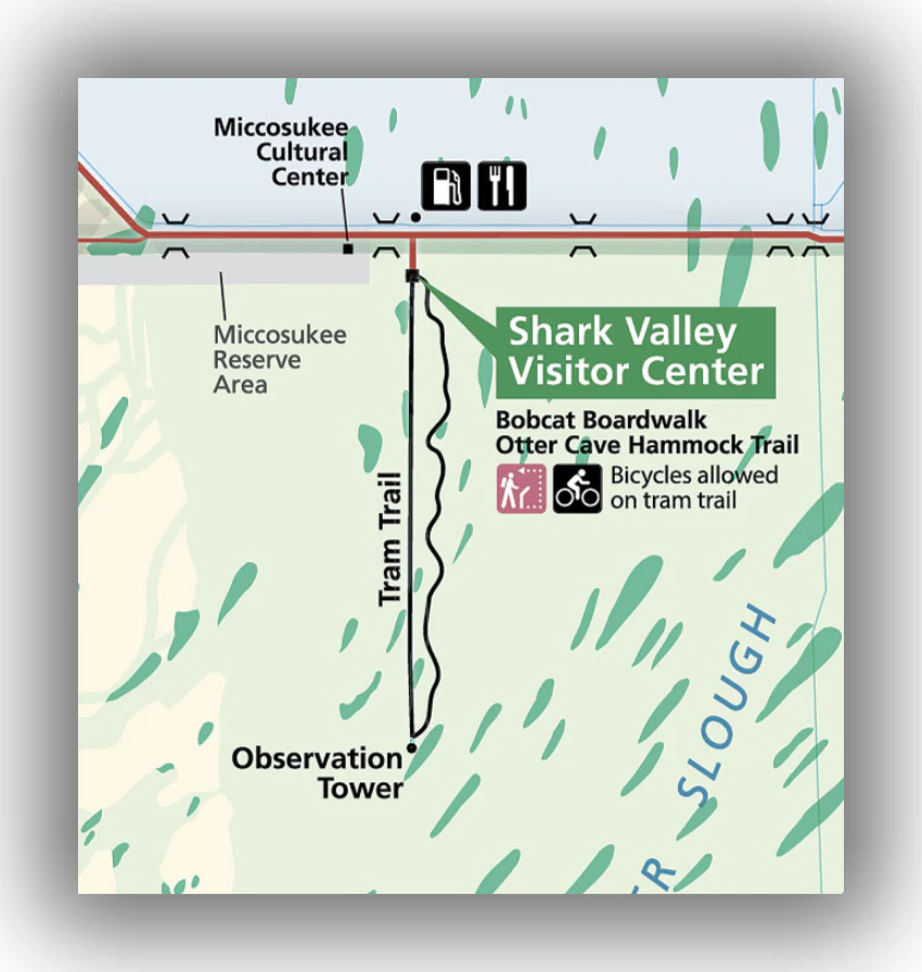 From the visitor center, there is a 7.5-mile paved loop road that leads through the heart of Shark Valley to a stunning observation tower. At the halfway point sits a 45-foot-high observation deck A gradual ramp makes it accessible and easy to climb.
