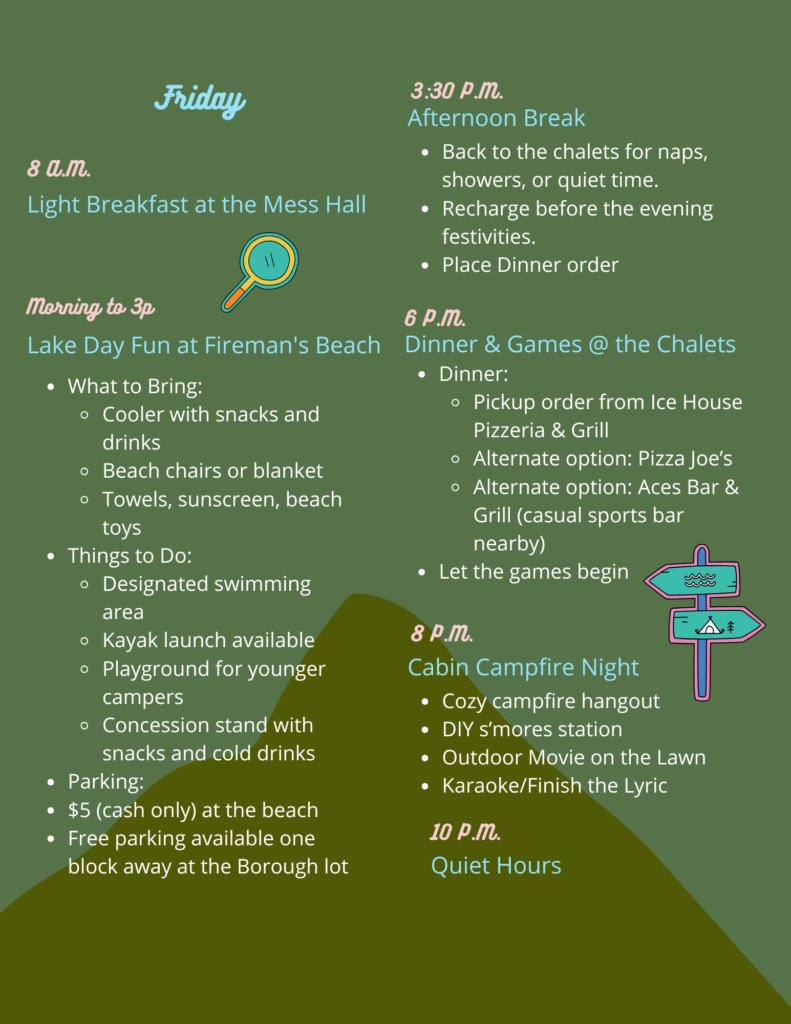 The 2 T-shirts we had found in our welcome basket the night previously? Our friends sneakily packed them, then donned them at the Lake! Big matching group with “Camp Culp” T-shirts.